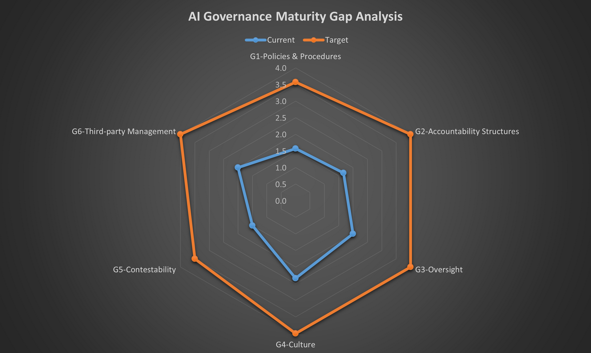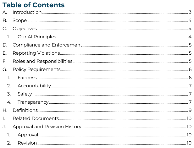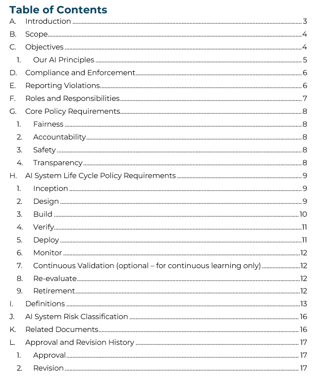 To help establish clear objectives for your AI governance goals, we include an AI governance maturity assessment to identify gaps and help you set your objectives.